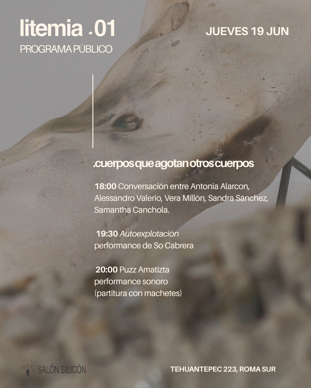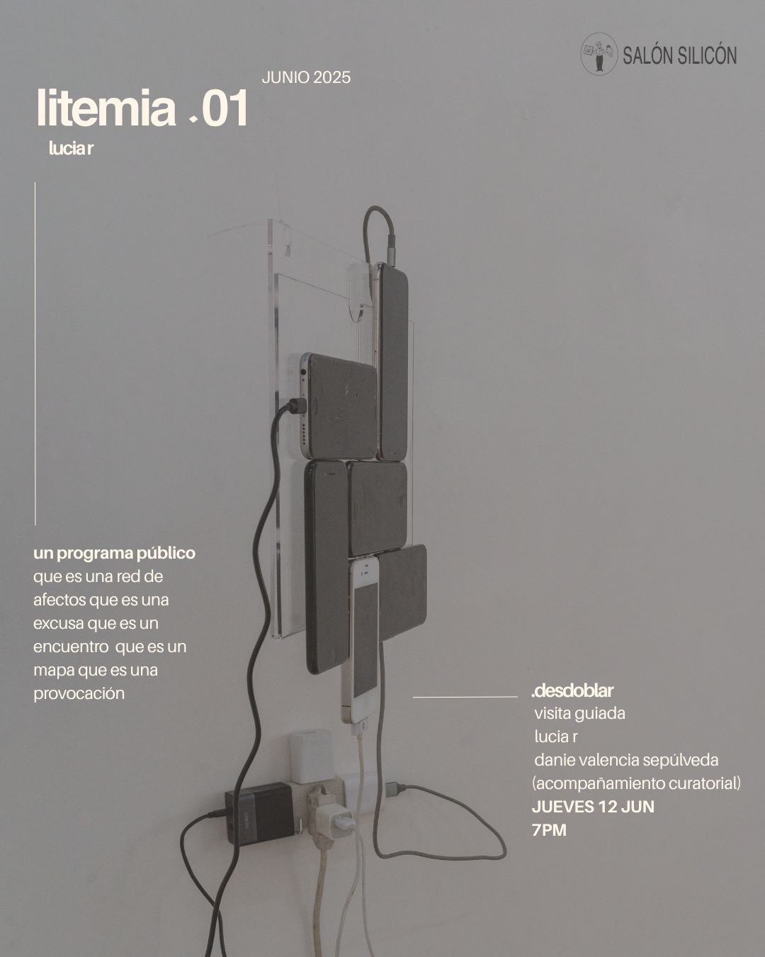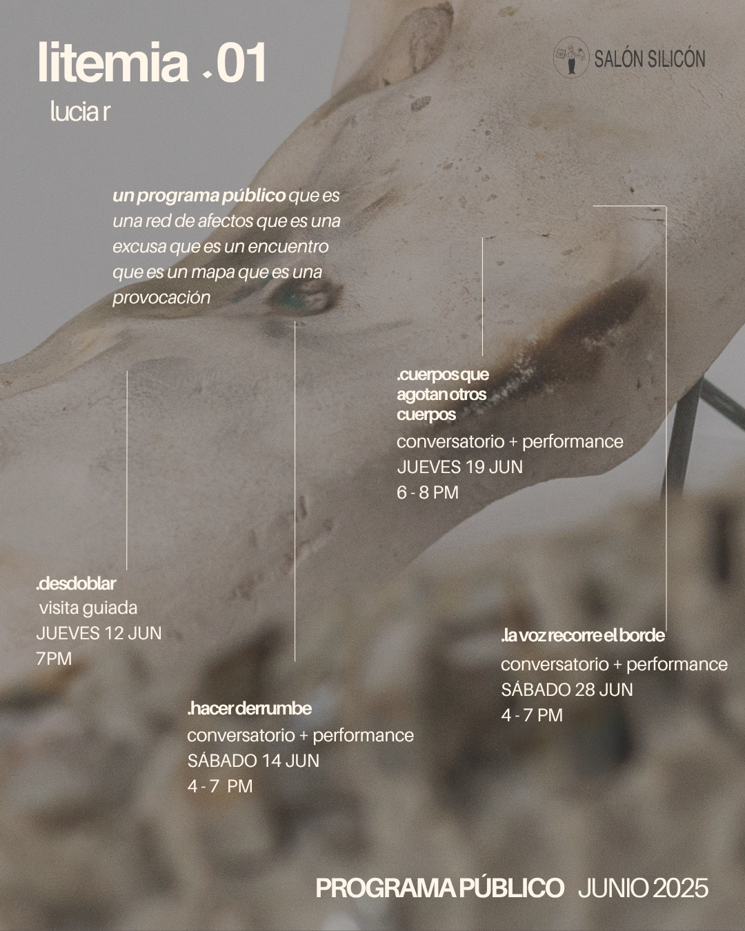 En el libro que coordina Bea Millón hay una frase que se me ha quedado rondando en la cabeza desde hace casi un año: todos somos seres minerales. A esto se junta otro planteamiento del libro acerca de la minería. En realidad hacemos minería todo el tiempo desde la cotidianidad de comer y nuestra relación con lo que llamamos alimentos. Pensaba en cómo desde mi relación con el litio hago minería con los dientes, con el estómago, con los riñones. Como me parece irónico que por mi garganta transcurra el “oro blanco” todos los días desde el borde de mi cama. Todos somos seres minerales y desde ahí también se puede pensar la indivisibilidad. ¿Qué implicaciones políticas / éticas / estéticas tiene relacionarnos con otros cuerpos? Me he cansado de aclarar que cuando digo cuerpos me refiero a cuerpos humanos, no humanos y más que humanos. Pero considero que esa aclaración ha llegado a un punto también de agotamiento. Exploro mi relación con el litio desde el entendimiento de que ambos somos cuerpos dentro de una red más compleja de significación y poder. La dinámica que se plantea desde el litio - psicofármaco alude al concepto de pharmakon de Derrida: una sustancia que es cura y veneno. En otra escala esa misma relación se replica con la promesa de una energía verde- litio que agota, seca y saquea otros cuerpos. En el centro de (Li)temia, investigacion artística de largo aliento, hay una profunda necesidad de poner en crisis la idea de funcionalidad que entre otras cosas, ha llevado a que permitamos el control de los cuerpos: cuerpos que consumen otros cuerpos para ser funcionales, como es mi caso y el de muchos; cuerpos que agotan otros cuerpos porque les funcionan para seguir en la inagotable búsqueda de energía. Desde ahí, desde pensar el agotamiento, la relación entre cuerpos es que invito a que nuestras investigaciones conversen. Un primer gesto para integrar más voces y experiencias a este mapa relacional que estoy trazando y que me desborda completamente. Desde ahí, platiquemos 🩶