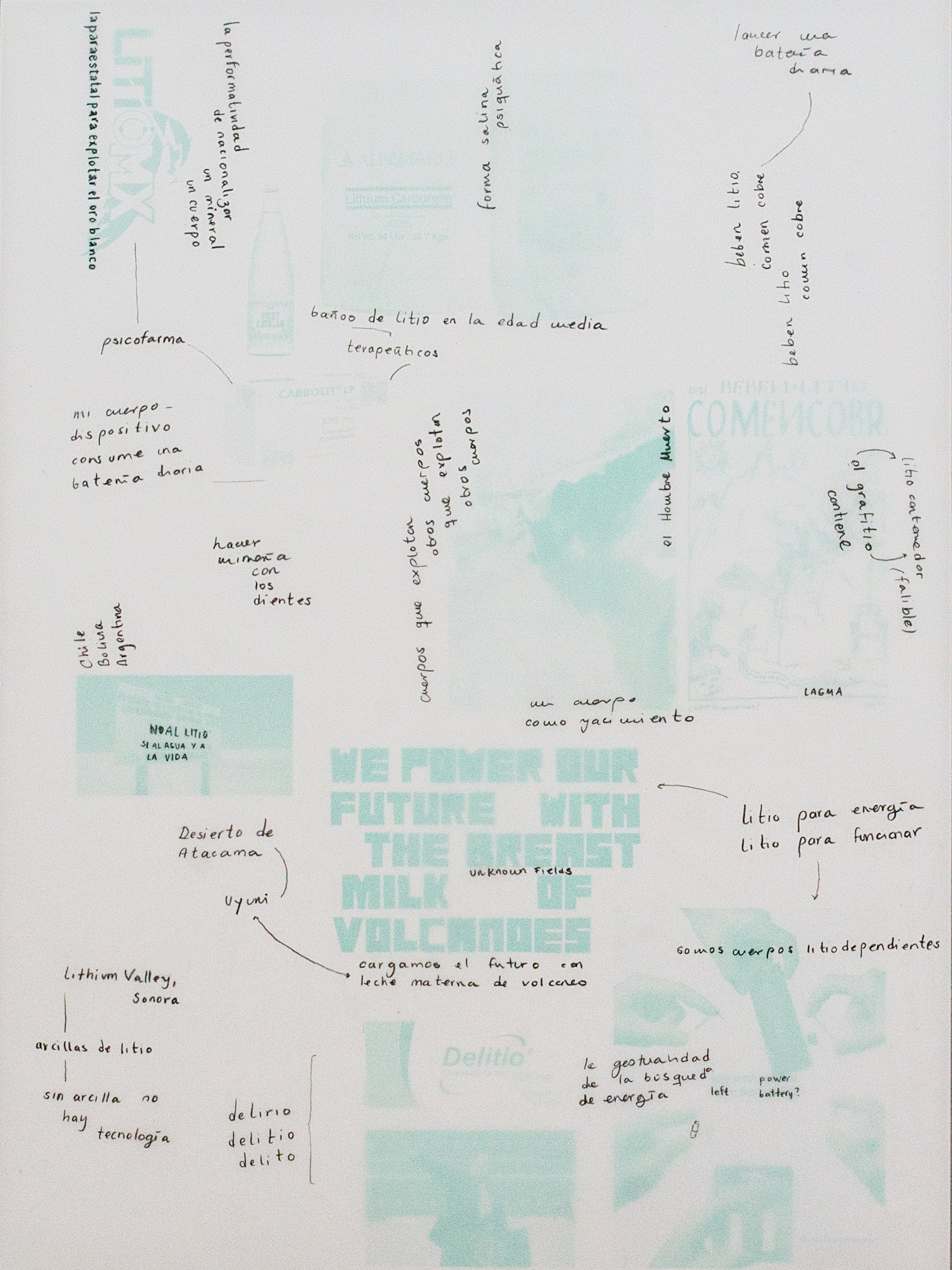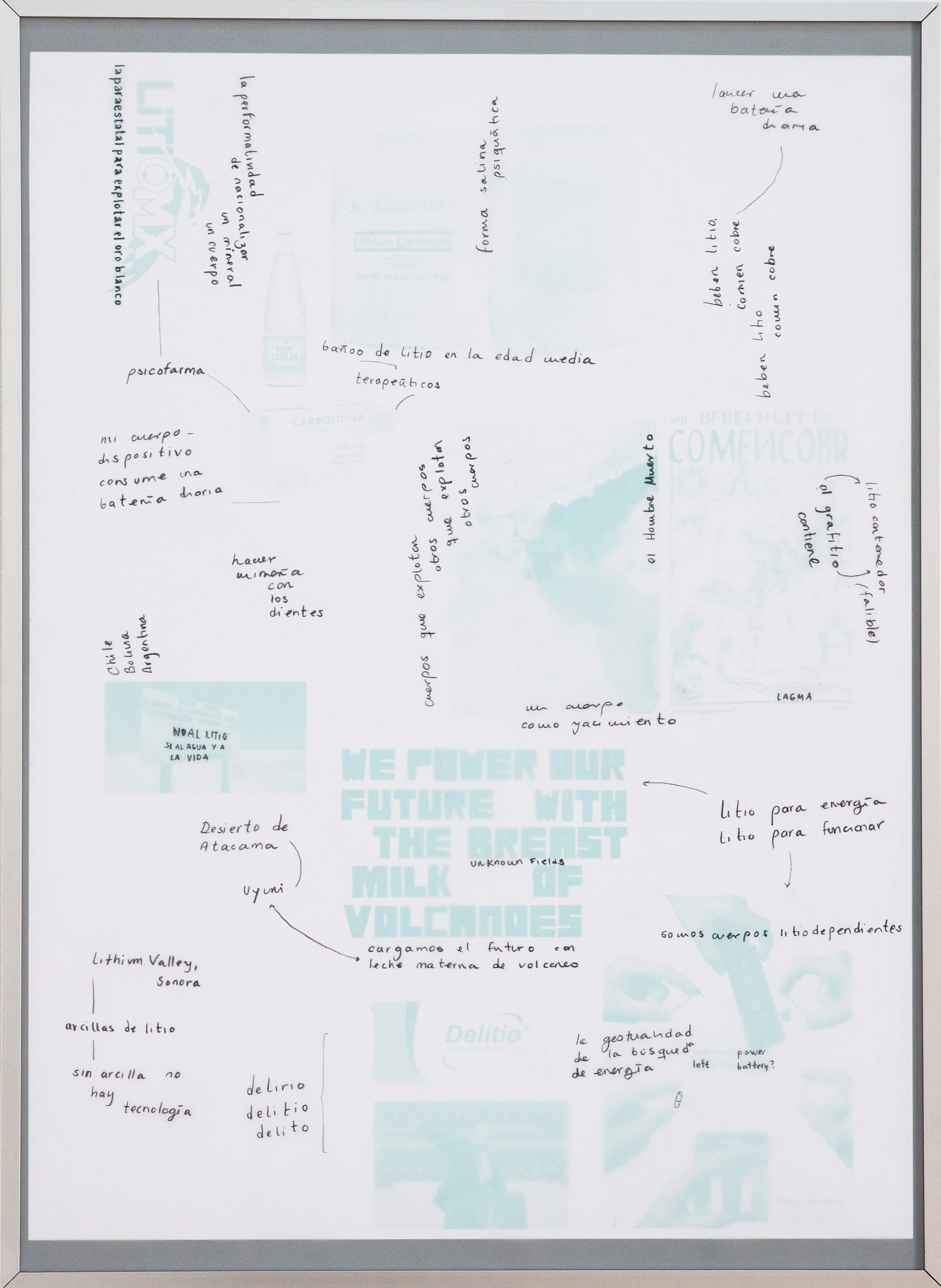 Actualmente, el proyecto busca expandir —tanto en amplitud como en profundidad— ese trabajo inicial, entendiéndolo como un fragmento ampliado del mapa relacional más extenso del litio. Esta investigación inicial trazó un mapeo preliminar de los actores clave y las dinámicas transversales, identificando conceptos centrales en el corazón de esta indagación: energía (en todas sus formas, que afecta a todo tipo de cuerpos, humanos y no humanos), regulación (baterías y pastillas como mecanismos reguladores), agotamiento (de cuerpos, dispositivos y territorios) y funcionalidad.