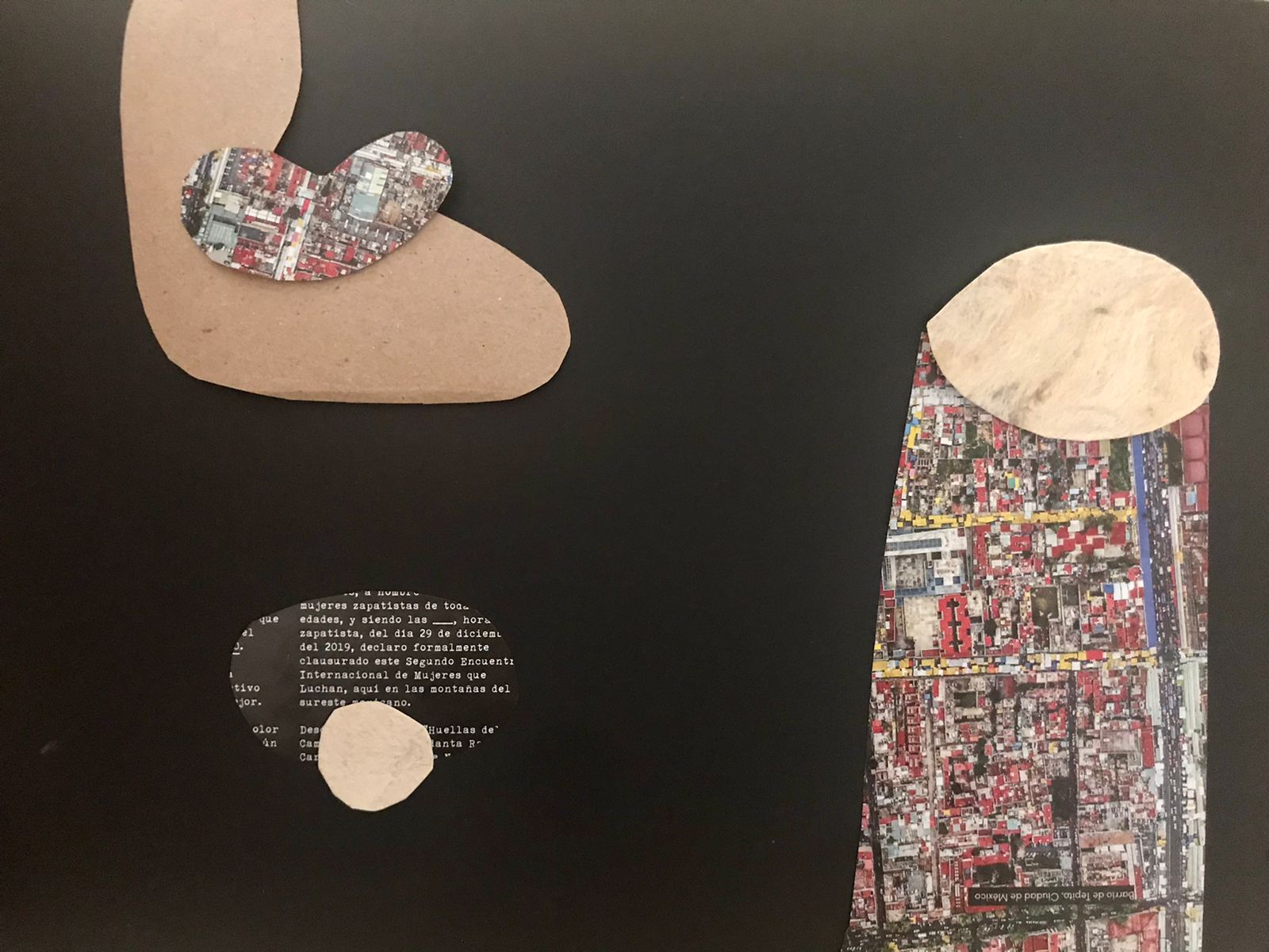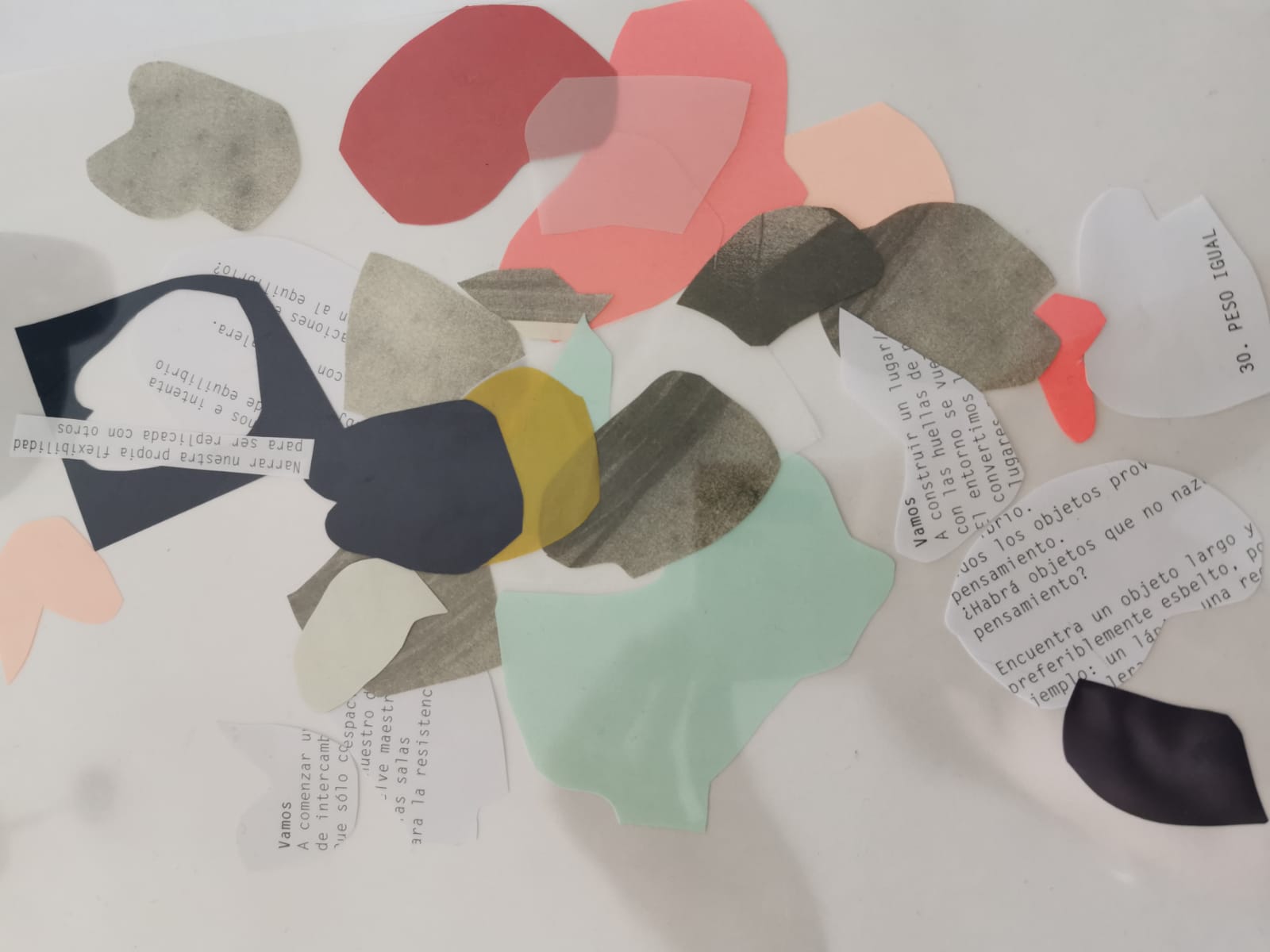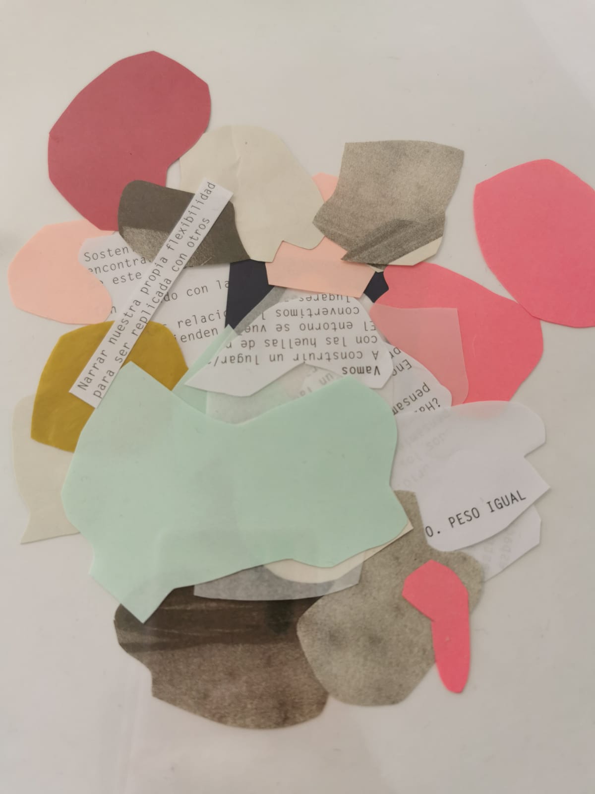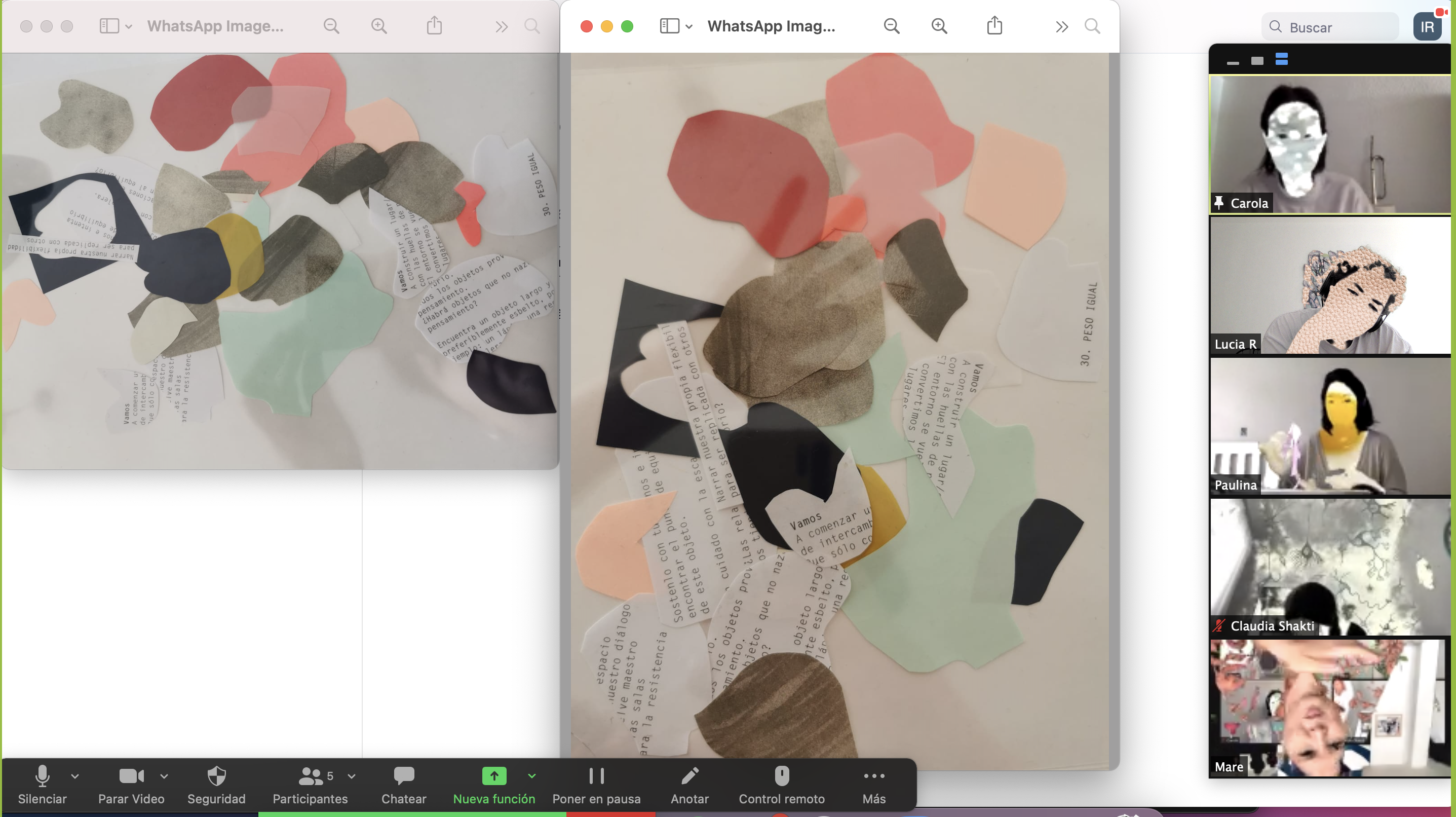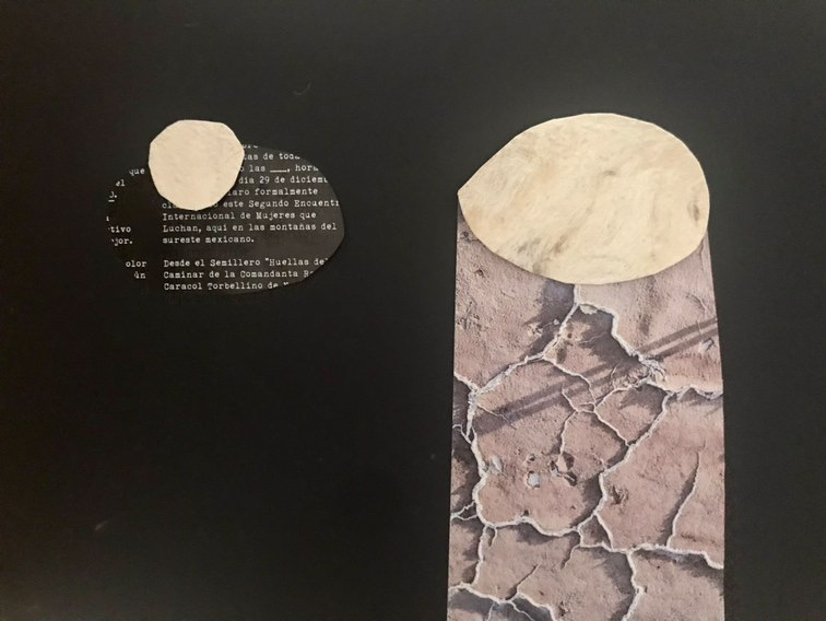 A partir de una pieza de poesía sonora y una meditación, las participantes exploraron sus entrecuerpos (espacios negativos del cuerpo) y las del resto del grupo para vaciarlos en collages de papel.