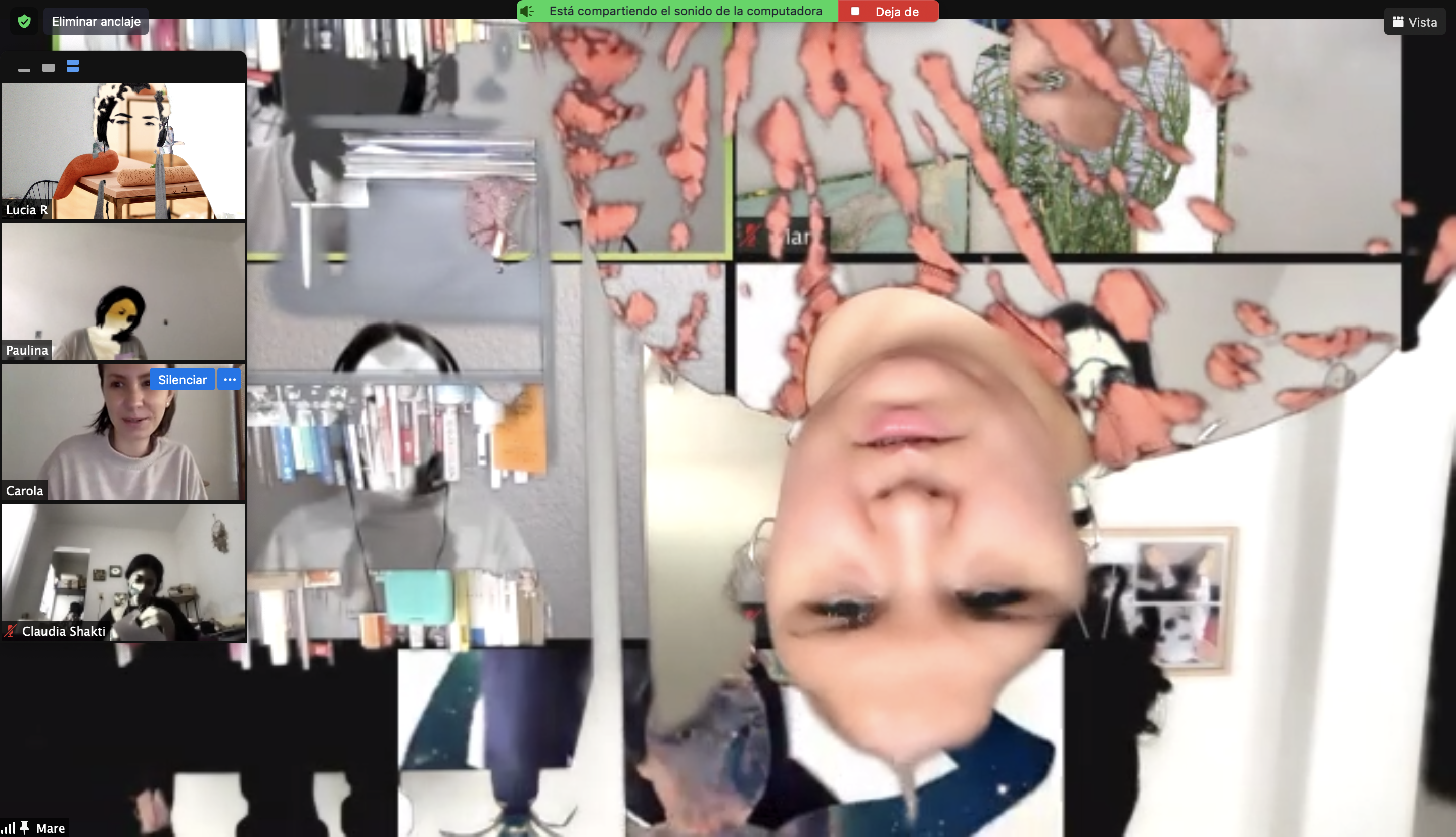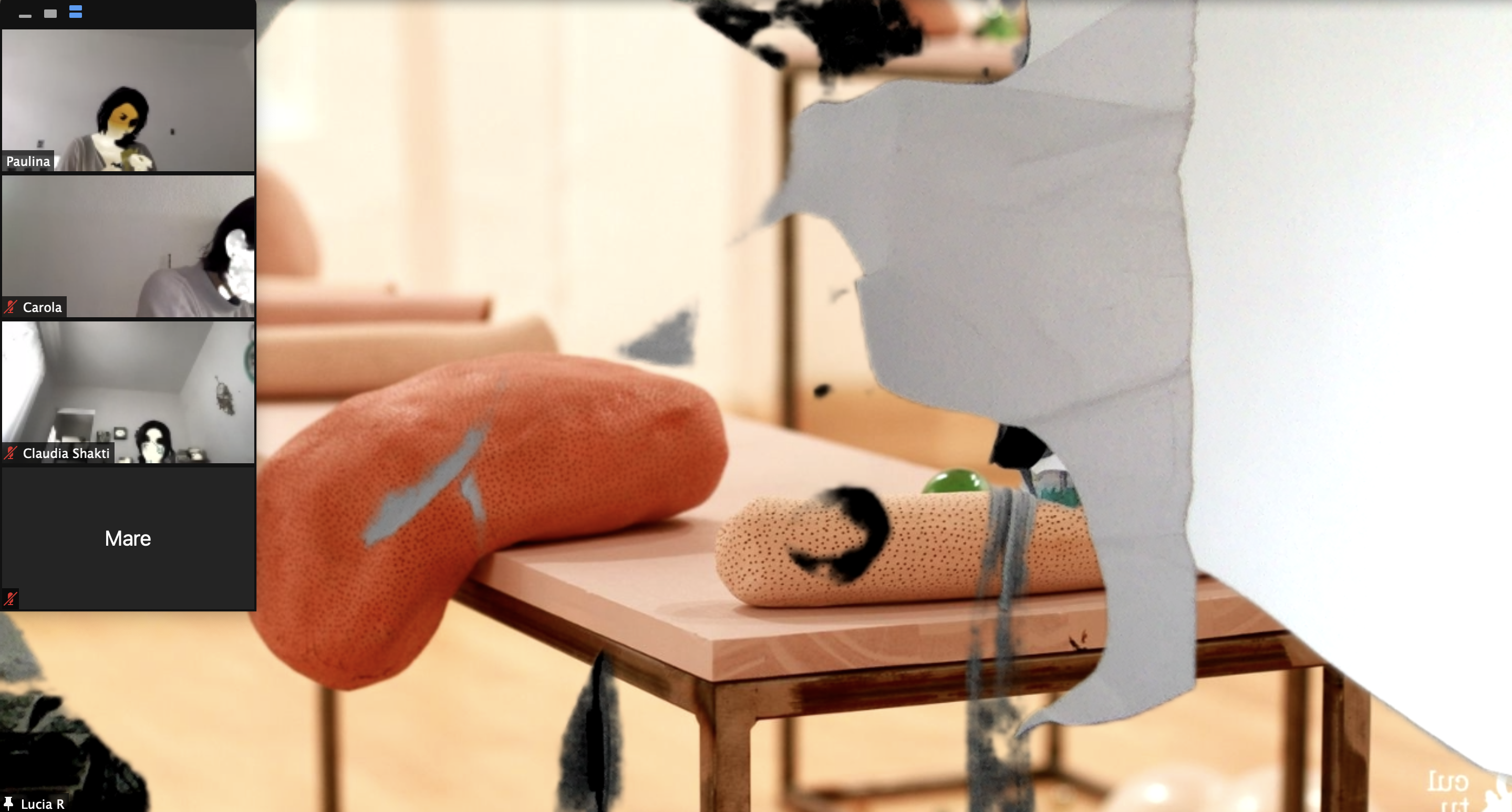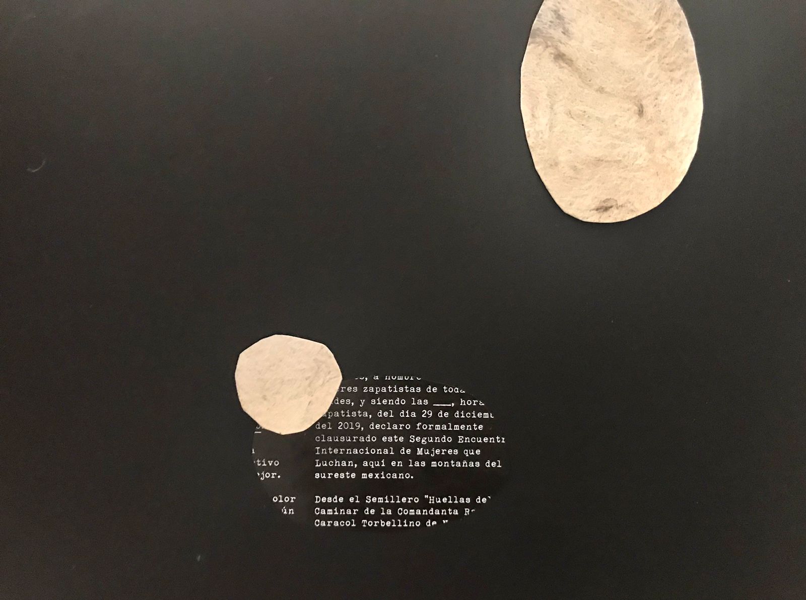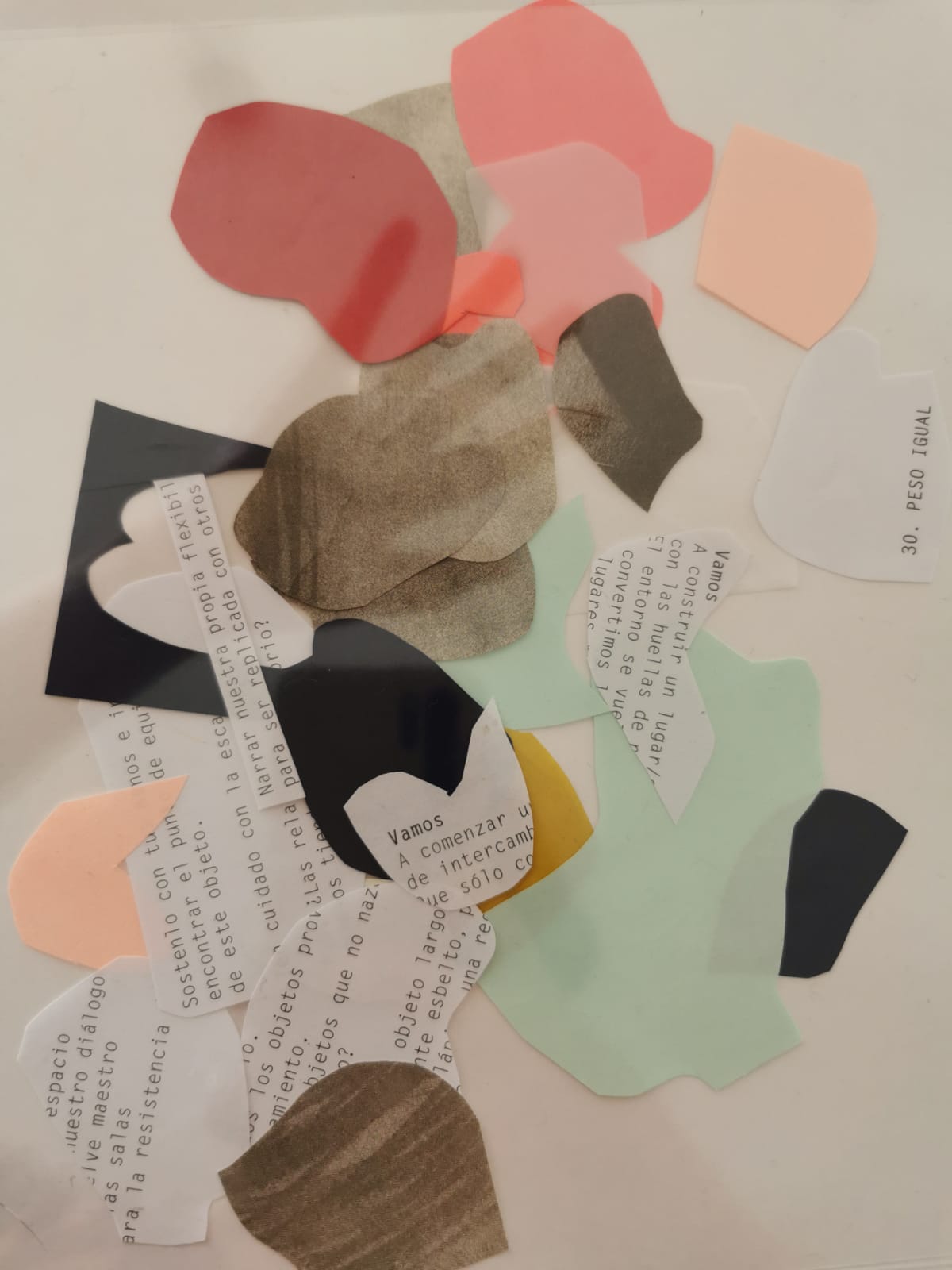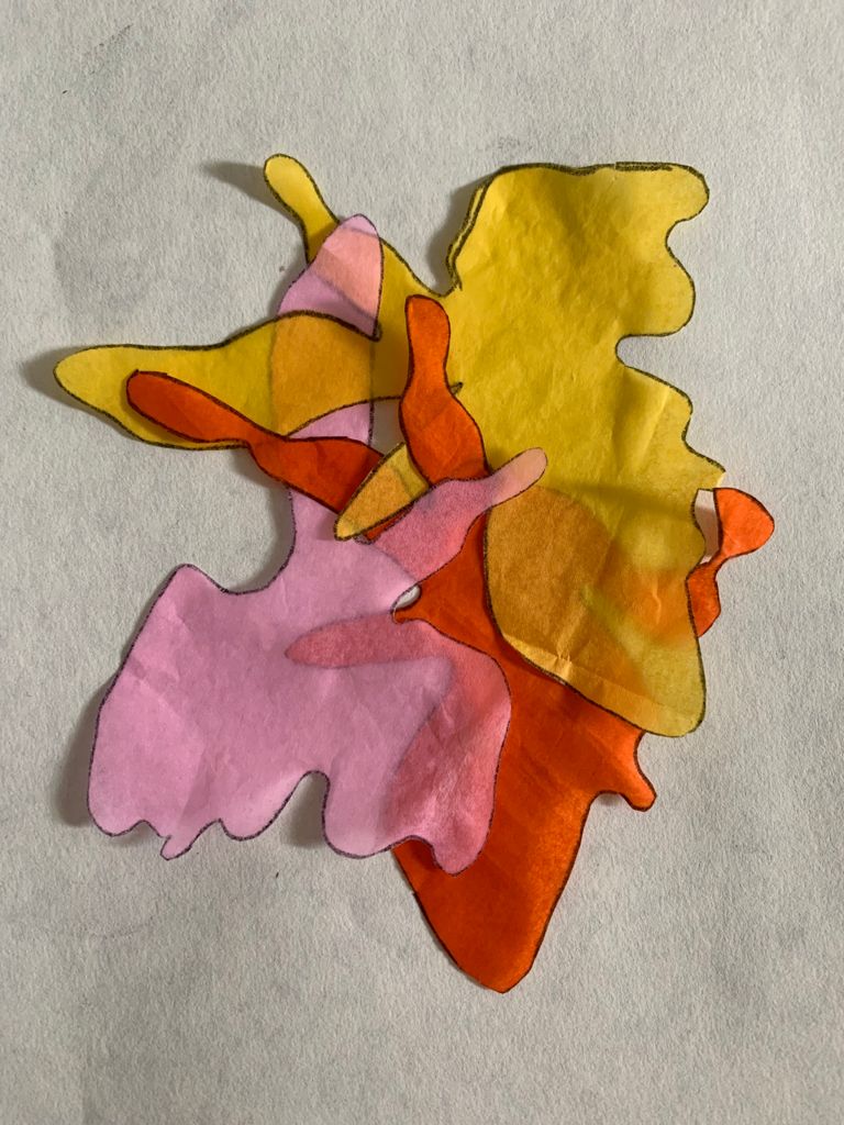 A partir de una pieza de poesía sonora y una meditación, las participantes exploraron sus entrecuerpos (espacios negativos del cuerpo) y las del resto del grupo para vaciarlos en collages de papel.